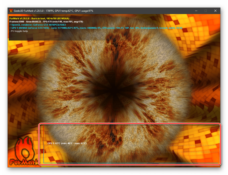 Во время тестирования видеокарты программой FurMark на экране будет вращаться изображение с глазом, а в верхнем левом углу и снизу начнут отображаться различные параметры состояния графического процессора. Нижняя полоса показывает температуру чипа GPU, которая после старта теста резко начнет расти.