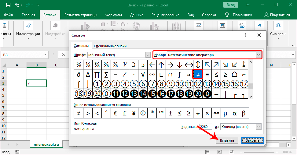Для параметра “Набор” выбираем вариант – “Математические операторы”. Выбираем знак щелчком мыши, жмем кнопку “Вставить”, после чего закрываем окно.