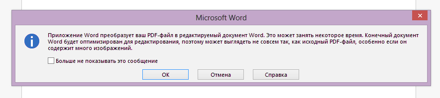 Начиная с версии 2013, программа Word, входящая в состав популярного дистрибутива Office, может открывать документы PDF. Для этого запустите Word. В меню выберите вкладку «Файл» затем «Открыть». Выберите ваш PDF-документ, при этом программа выдаст сообщение, что будет преобразование открываемого документа в файл DOC, и нажмите «Ок».