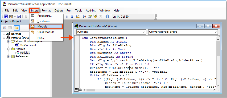 Код VBA: пакетное преобразование нескольких документов Word в файлы PDF в Word
