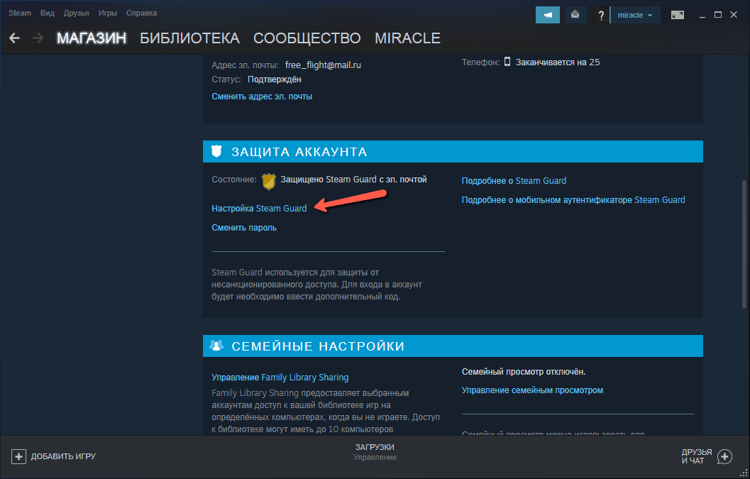 Теперь просто перезапустите программу. Повторно открыв настройки, вы увидите, что статус безопасности вновь изменился. Steam Guard активирован.