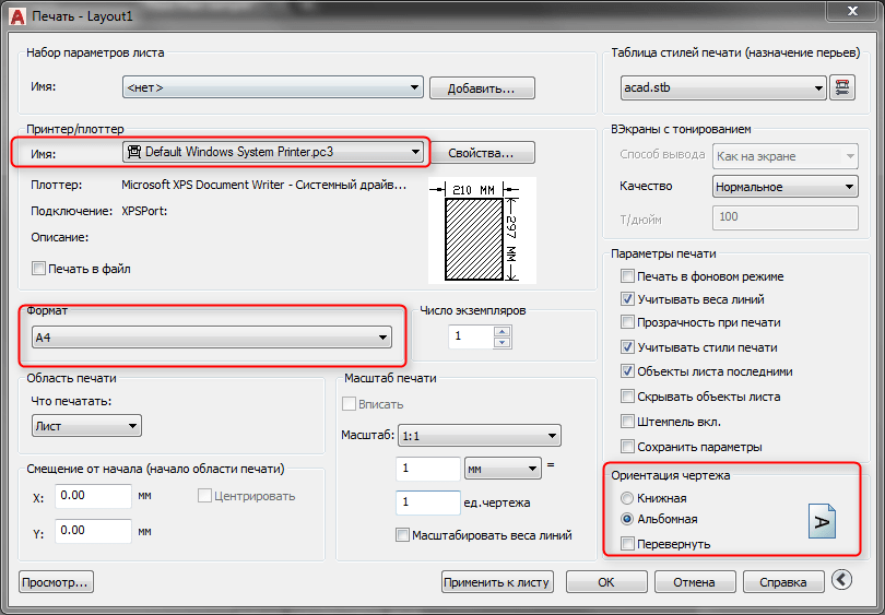 2. Выберите принтер, формат листа и ориентацию чертежа.