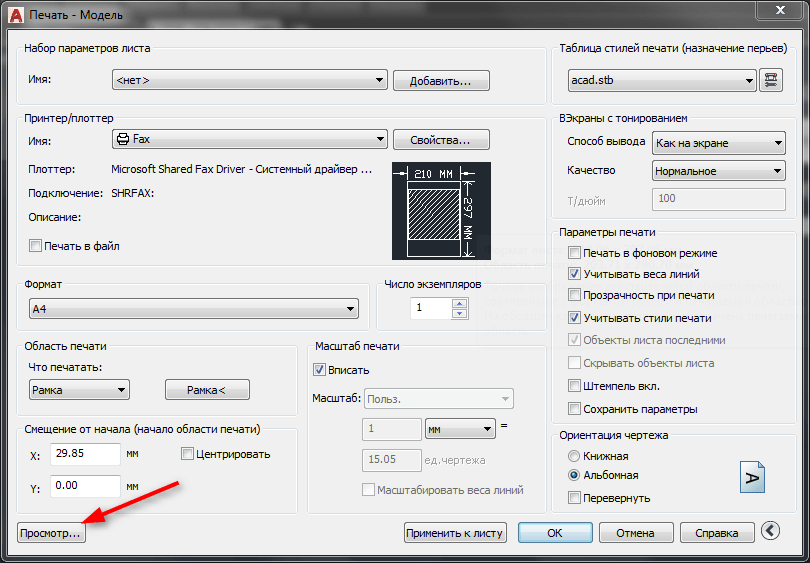 Печать чертежа в autocad из пространства модели