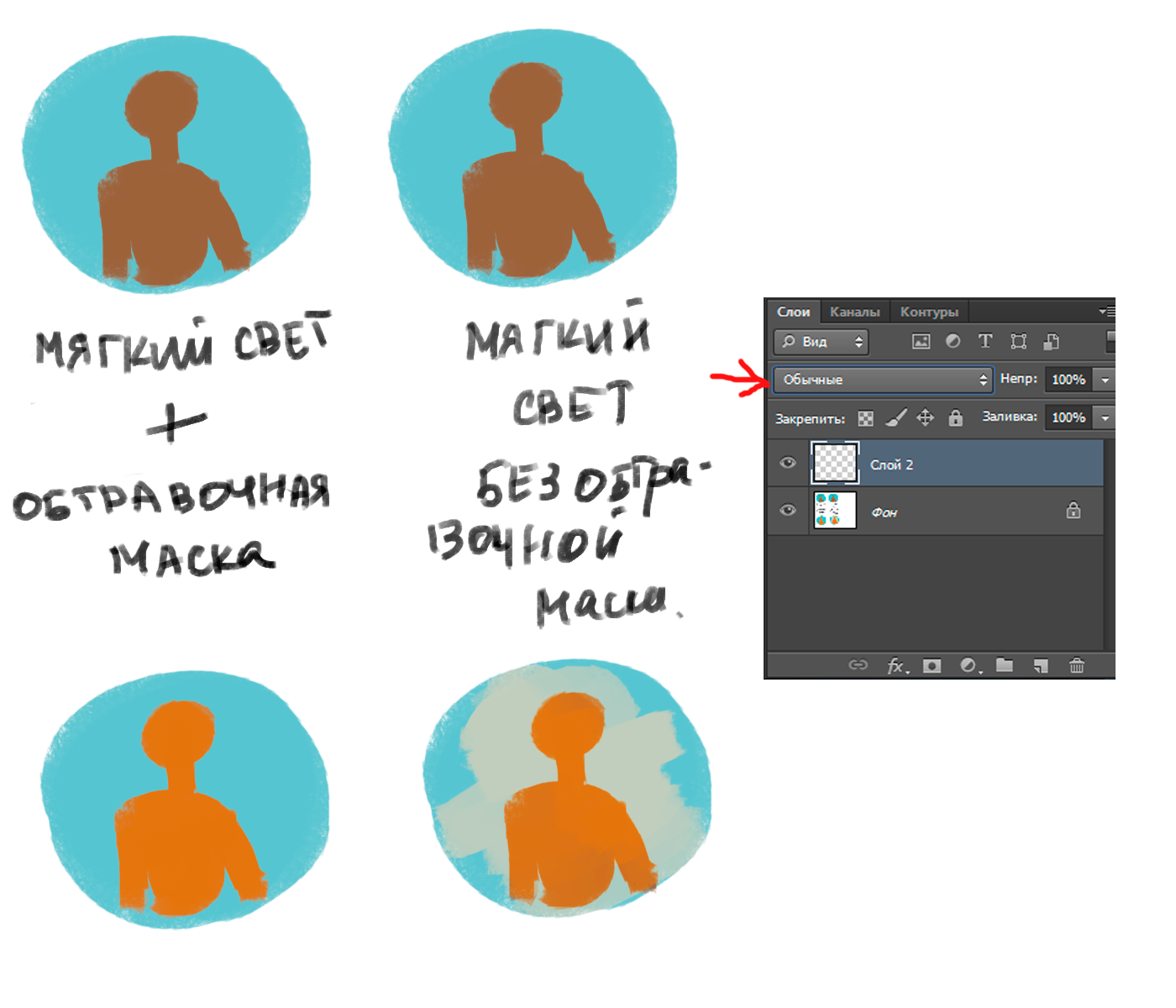 В фотошопе есть такая штука, как режимы наложения. Кнопка, отвечающая за режимы наложения, находится прямо над слоями и на ней по-умолчанию стоит значение «Обычные». Чтобы открыть окно, нужно нажать на него левой кнопкой мыши и выбрать любой режим тем же нажатием ЛКМ.