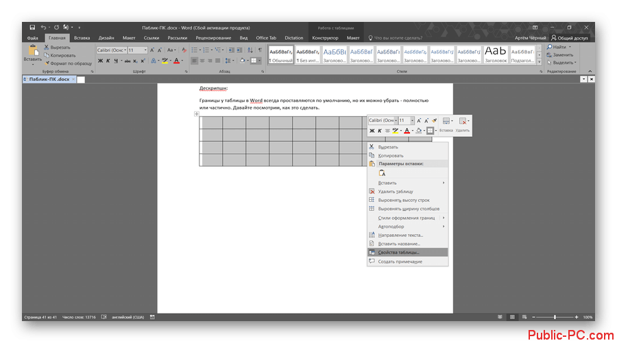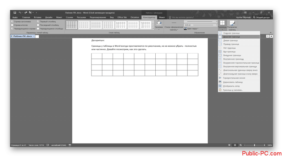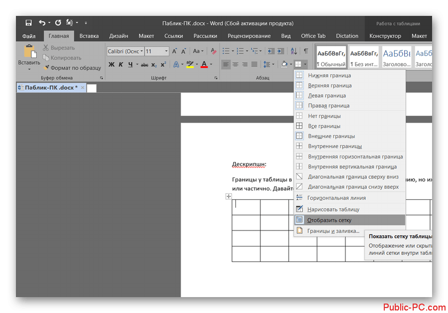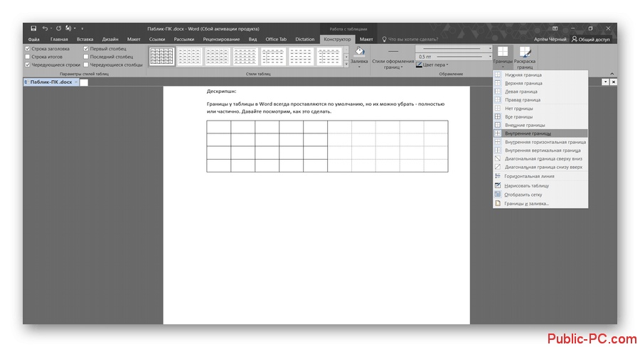 Как убрать границы у таблицы в Word