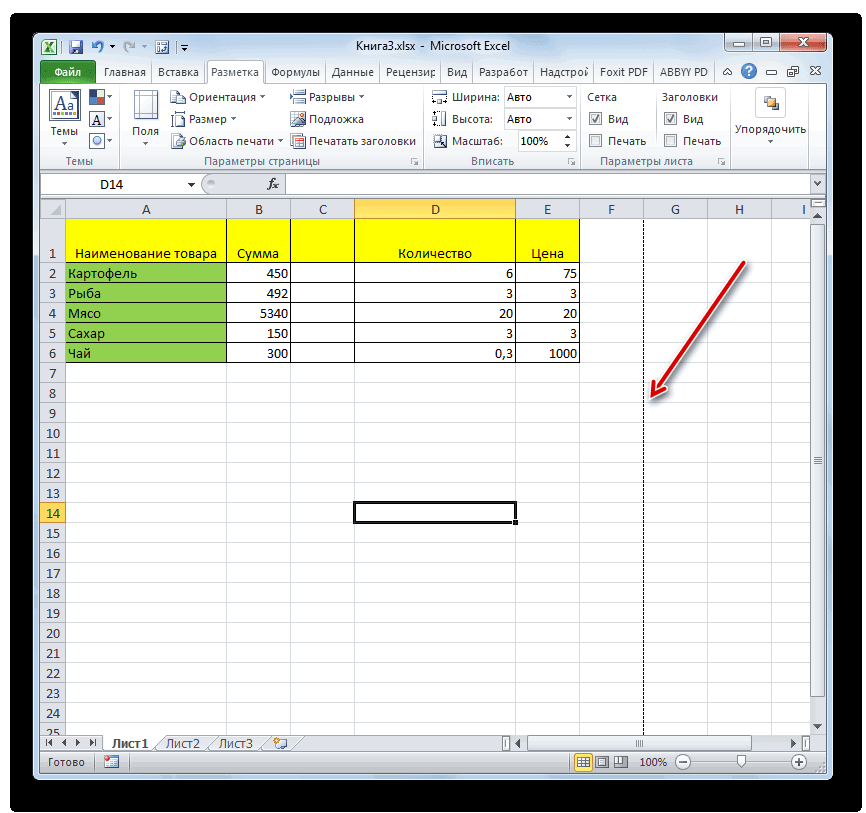Кроме того, лист Excel также может быть размечен длинными пунктирными линиями. Подобная разметка носит название разрыва страницы. Она может быть включена только вручную, поэтому для её отключения нужно проделать некоторые манипуляции в программе. Подобные разрывы включают в том случае, если нужно распечатать определенные части документа отдельно от основного тела