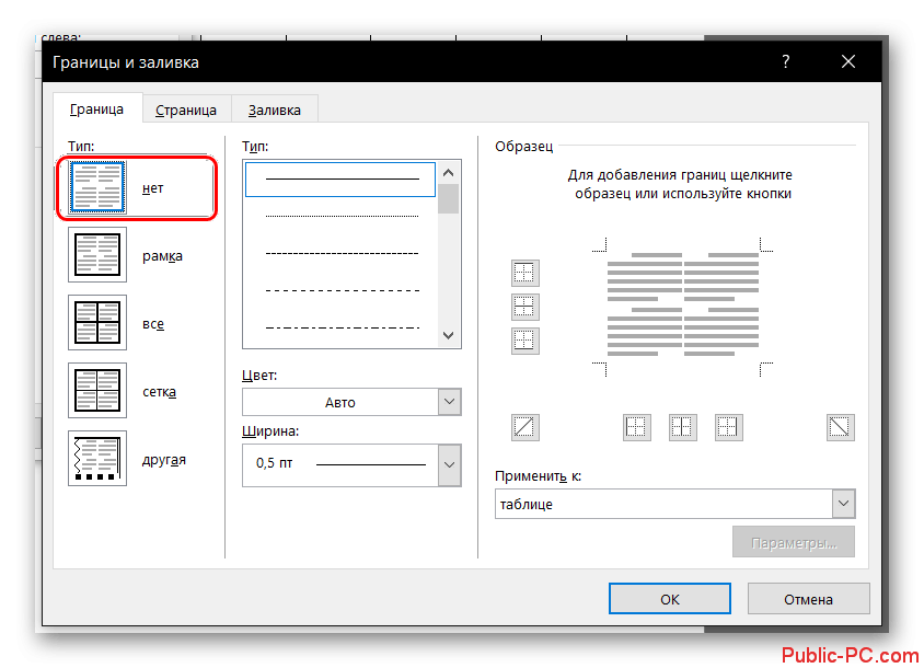 В следующем окне в разделе «Тип» выберите первый пункт «Нет». В разделе «Применить к» установите параметр «таблице». Нажмите кнопку «ОК» в каждом из двух открытых диалоговых окон.