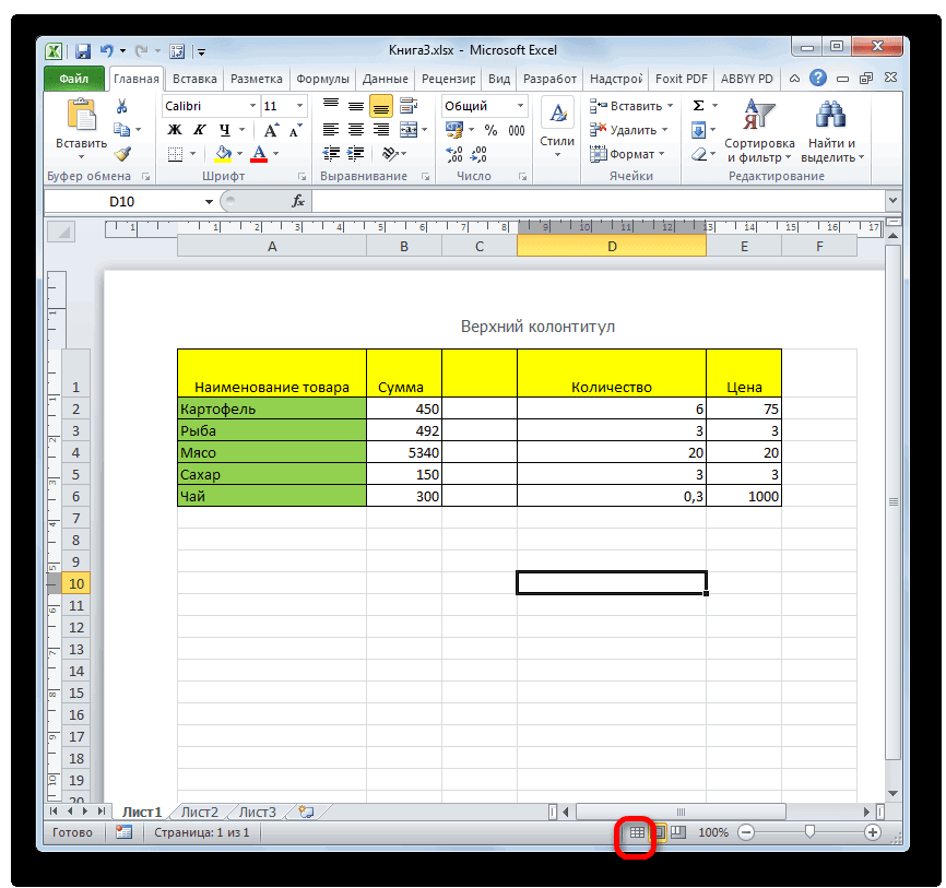 При двух последних режимах лист разбит на части. Чтобы убрать это разделение просто кликаем по пиктограмме «Обычный». Происходит переключение режима.