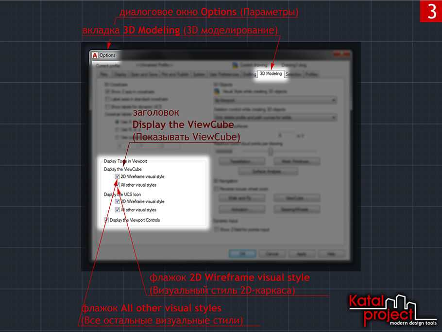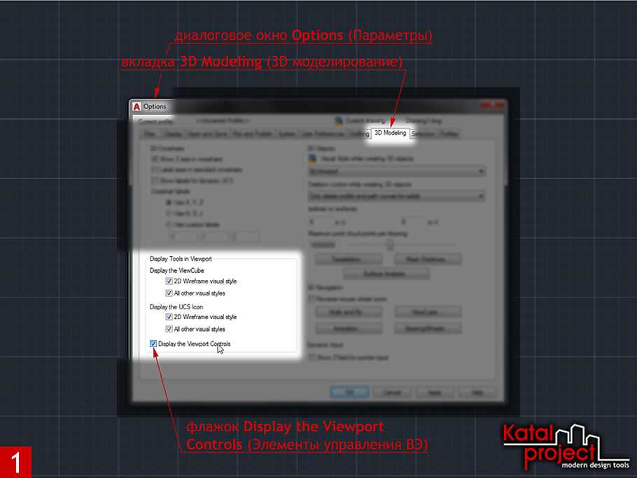 Во вкладке «3D Modeling» (3D-моделирование), в разделе «Display Tools in Viewport» (Инструменты на видовом экране), снять галочки «2D Wireframe visual style» (Визуальный стиль 2D-каркаса) и «All other visual styles» (Все остальные визуальные стили), объединенные заголовком «Display the ViewCube» (Показывать ViewCube) ;