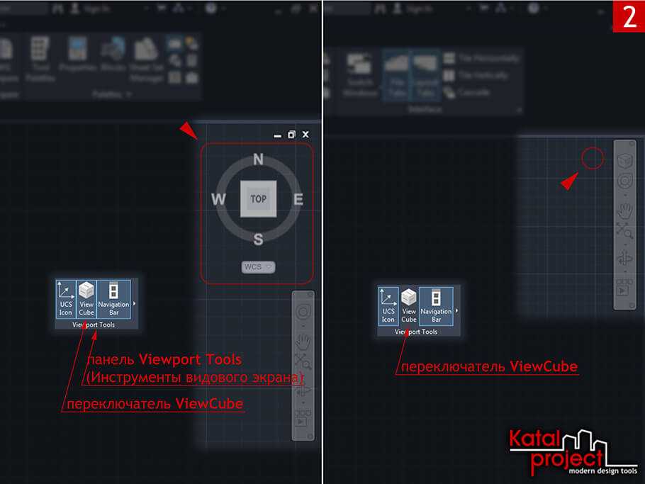 Скрытие Viewport Controls: 1 — Диалоговое окно Options; 2 — Системная переменная VPCONTROL
