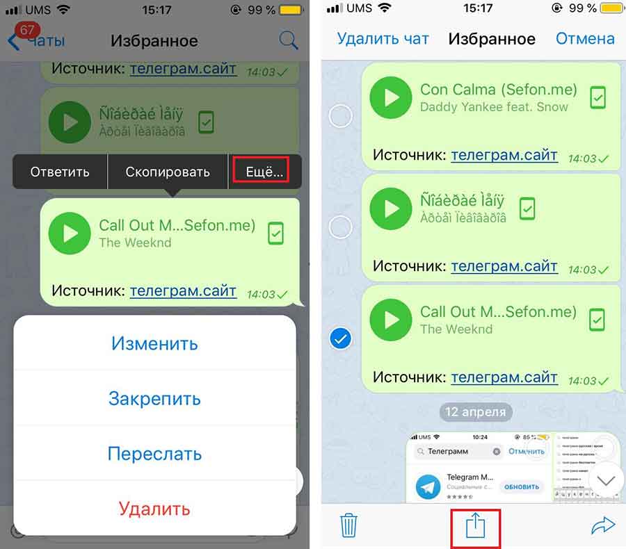 После установки дополнительного проигрывателя нужно зайти в Telegram и удерживать ту песню, которую пользователь хочет скачать. Открывается вводное окно, в котором нужно нажать на «ещё» и на середину появившейся линии, напоминающей контейнер со стрелочкой вверх.