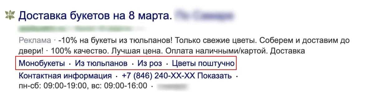 Google Ads позволяет разместить для мобильной версии поиска от одной до восьми дополнительных ссылок, а для десктопной — от двух до шести. В Яндекс.Директе можно добавлять до восьми быстрых ссылок. Специалисты рекомендуют размещать в них призывы к действию, конкурентные преимущества, страницы, которые отвечают на вопросы и возражения клиентов, а также декомпозицию предложения.