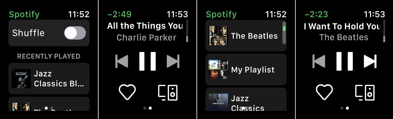 Затем вы можете пролистать коллекции, синхронизированные с вашими часами. Нажмите на альбом, плейлист, исполнителя или песню, которую вы хотите услышать. Вы можете управлять своей музыкой с ваших часов, нажав на кнопку «Воспроизведение / Пауза», перейдя к следующему треку или к предыдущему треку. Вы также можете регулировать громкость, поворачивая цифровую корону.