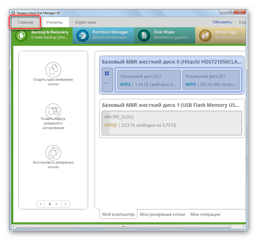 - Подключите к компьютеру флешку, которую хотите сделать загрузочной, и после запуска Paragon Hard Disk Manager перейдите во вкладку «Главная».