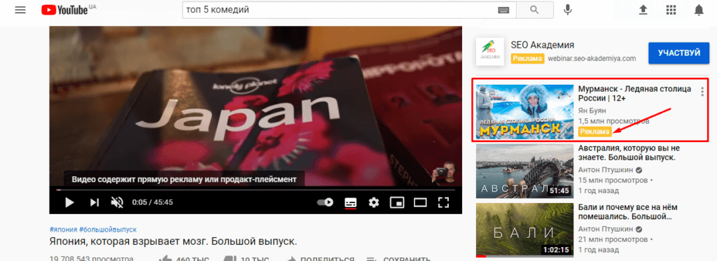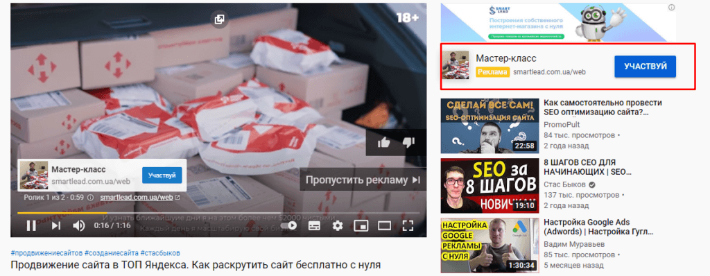 На страницах YouTube. Баннеры находятся в верхнем углу справа, выше рекомендованного контента. Некоторое время тому назад подобные баннеры имели другой фон и подпись «Реклама», но после появления нативной рекламы фон и надпись убрали. Сейчас аудитории сложно понять, реклама это или нет. За счет изменений конверсия выросла.