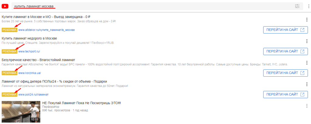 Такое видео длится от 3 до 60 минут. Его могут увидеть пользователи, которые ищут ролики в результатах поиска, списках похожих роликов, на главной странице YouTube. Объявление содержит кадры из видео и текст.