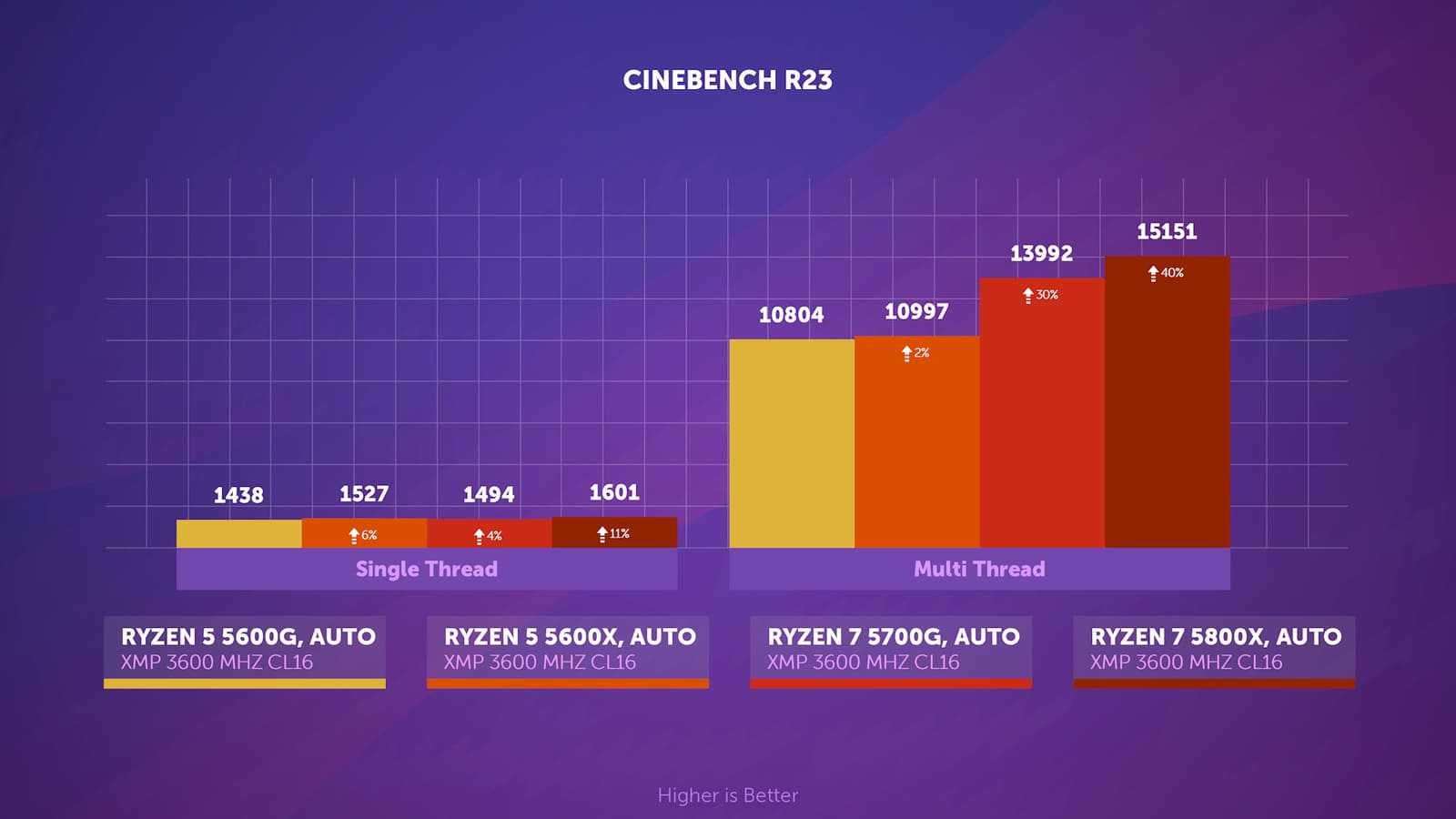 Что же выходит в итоге? Процессорная часть APU так и осталась где-то между прошлым и текущим поколением обычных процессоров райзен, даже несмотря на сокращение в отставании по объёму L3 кэша и больший разгон памяти. То есть 5600G аналогом 5600X не назовёшь. В любом случае производительность куда выше 4000 серии.