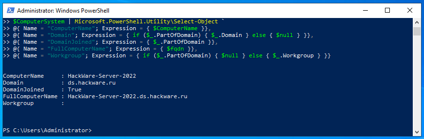 Используя командную строку (PowerShell) вы также можете узнать, прикреплён ли компьютер к домену или входит в рабочую группу.