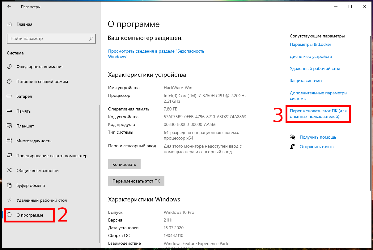 В англоязычной версии это соответственно «Settings» → «System» → «About» → «Rename this PC (advanced)».