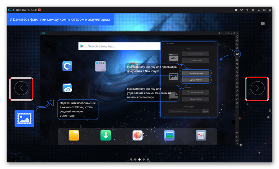 В эмулятор, помимо контента из Плей Маркета, можно загружать игры и приложения прямо с компьютера. Для этого вам необходимо скачать файл приложения в формате APK и просто перетащить его на рабочий стол Nox App Player. После этого сразу начнется установка, по окончании которой вы увидите значок этого приложения на главном экране. Таким образом, как и на смартфоне, вы можете устанавливать приложения двумя способами.
