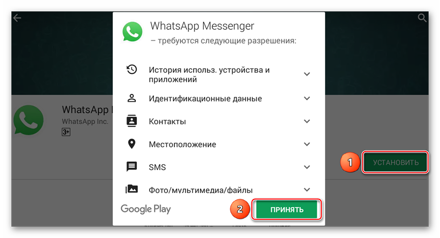 Для того чтобы установить необходимое приложение, вам нужно ввести его название в строку поиска в приложении Play Market, выбрать его, нажать кнопки «Установить» и «Принять». На изображении ниже данная процедура показана на примере популярного мессенджера WhatsApp.
