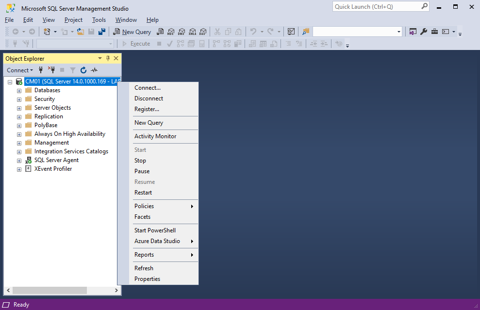 Launch the SQL Server Management Studio, Right-click on the CM01 (SQL Server) and select Properties.