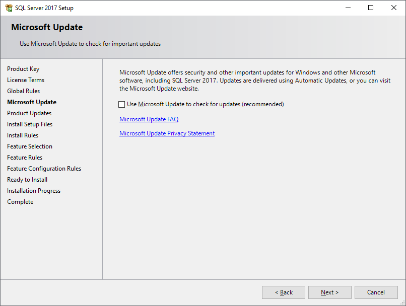 In the Microsoft Update we’ll skip the check updates for now, click Next.