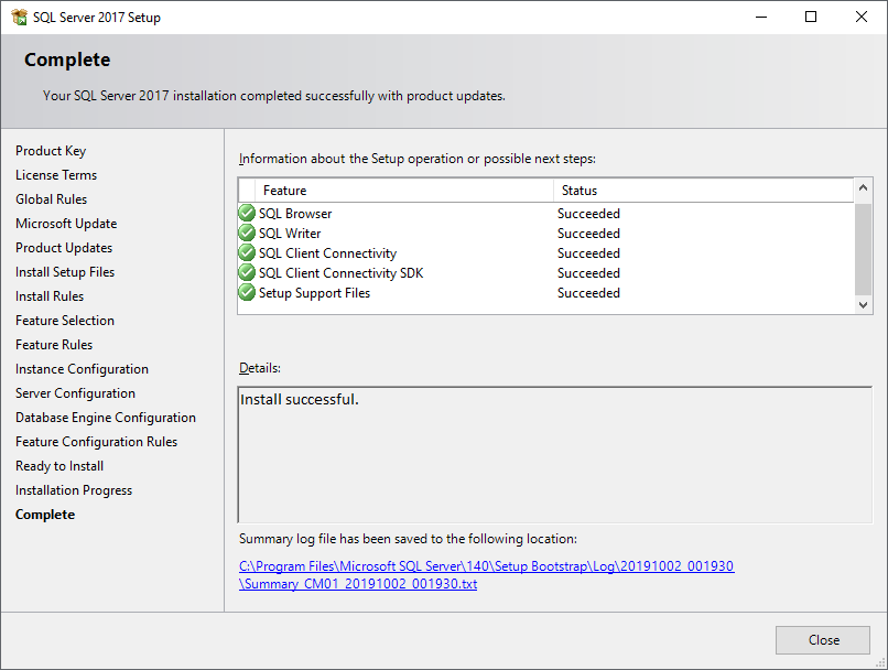 Confirm that SQL Server 2017 is successfully installed, click the Close button to complete the installation.