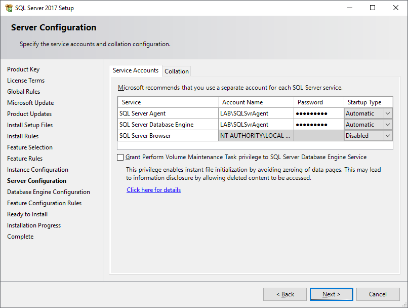 In the Server Configuration, Service Accounts tab, make sure to configure ALL SQL services to run under a domain user account (e.g., LAB\SQLSvrAgent) instead of the local system or network services.