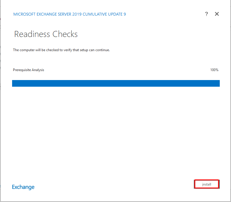 9. Мастер установки Exchange 2019 выполнит проверку предварительных требований. Если какой-то пункт не будет выполнен, то мастер установки сообщит об этом. Нажимаем кнопку “Install”.