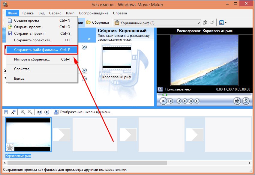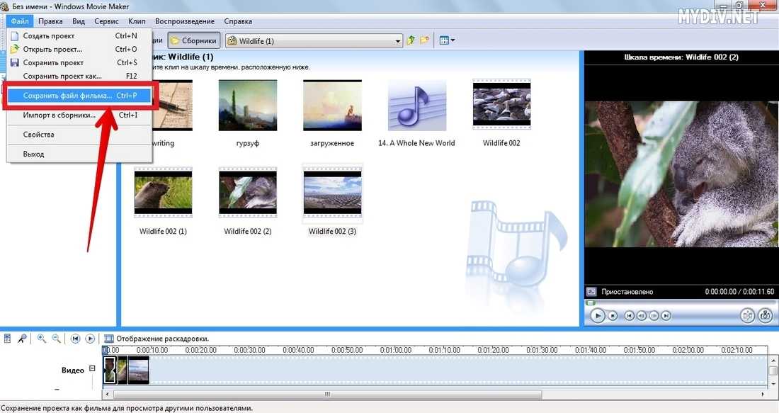 Сохраняем наше новое видео, используя вкладку Файл → Сохранить файл фильма как: