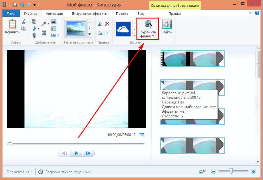 - Во вкладке «Главная» нажать на стрелку рядом с кнопкой «Сохранить фильм».