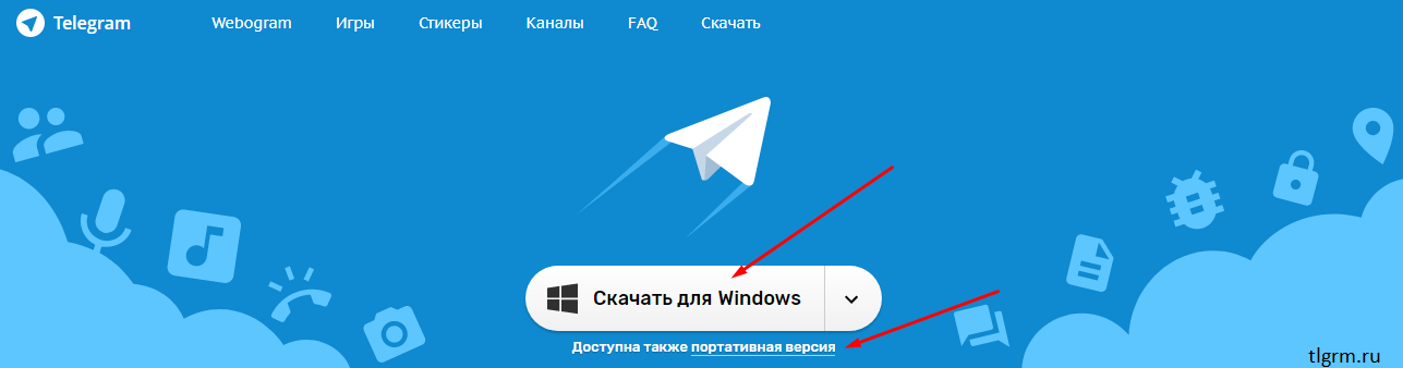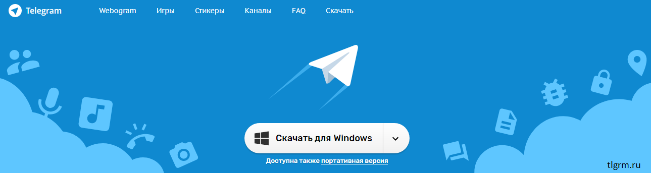 - Перейдя на официальную страницу сайта https://tlgrm.ru/ нажать кнопку «Скачать для Windows», которая находится на голубом поле в верхней части экрана.
