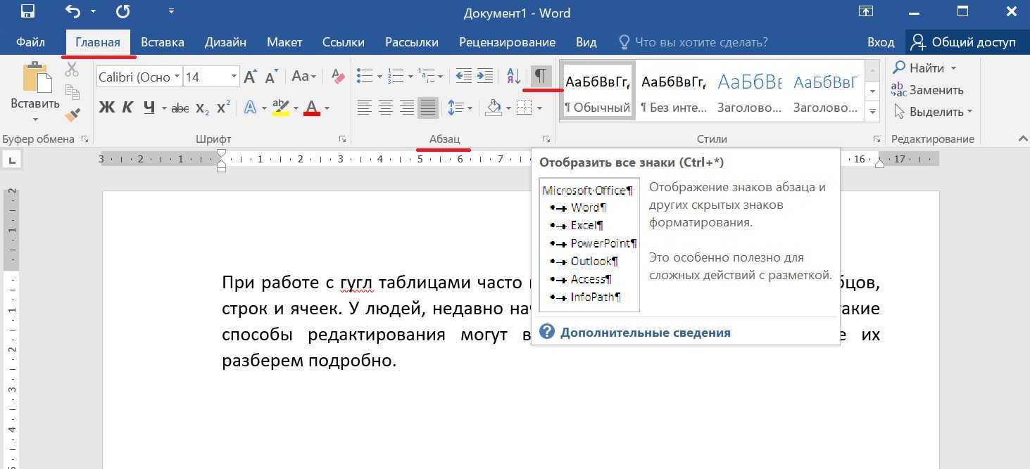 - В программах Word 2019, 2016, 2013, 2010, 2007 войдите в меню «Главная», в группе «Абзац» нажмите на значок «Отобразить все знаки» (¶).