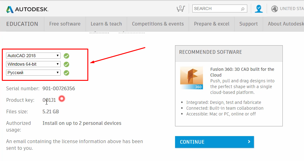 Далее просят ввести Ваши данные как “студента” – имя института, год поступления и год окончания. Вводим все на латинице, нажимаем кнопку и готово – теперь можно скачивать Автокад. Выбираем его, щелкнув по соответствующему значку, далее заполняем три поля-списка – выбираем версию автокада, битность Вашей системы (32 или 64 бита, о том как выбирать показано в видео в начале статьи), и затем язык интерфейса Автокада. После чего появятся серийный номер и ключ продукта для будущей активации Вашего Автокада, которая нужна будет после установки: