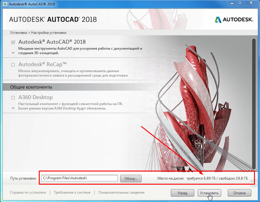 Доходим до кнопки “Установить”, там проверяем внизу сначала, хватает ли свободного места на выбранном диске для установки Автокада: