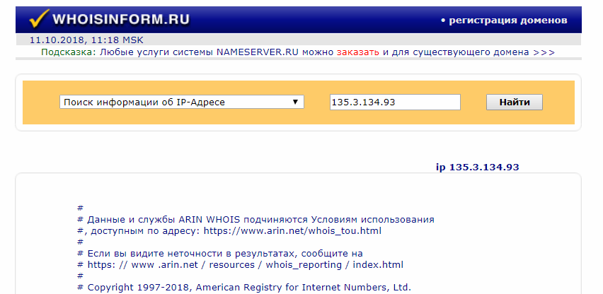 Whoisinform.ruЭта служба поможет вам узнать данные о доменах 2 уровня, принадлежность айпи адреса к сетям, данные по идентификатору NIC.