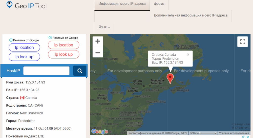 Geoiptool.comВ отличии от остальных сервисов, на этом отображается сразу карта Google с данными. Есть удобная раскладка с выбором языка.