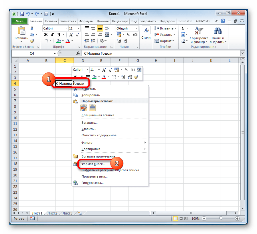 - Выделяем ячейку, в которой текст выходит за пределы границ. Кликаем по ней правой кнопкой мыши. В открывшемся списке выбираем пункт «Формат ячеек…».