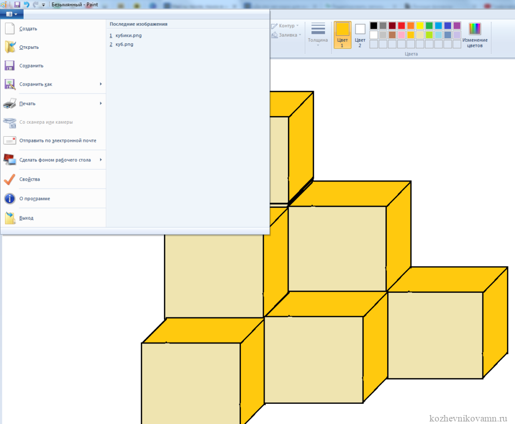 При конструировании в программе Paint необходимо соблюдать несколько правил. Во-первых, любую конструкцию в программе необходимо начинать с сзади, снизу и слева. Следовательно, устанавливаем сначала кубики, которые находятся на заднем плане, затем конструируем низ объемной фигуры и слева объемную фигуру. И только потом достраиваем объемную фигуру с других сторон, последовательно добавляя кубики.