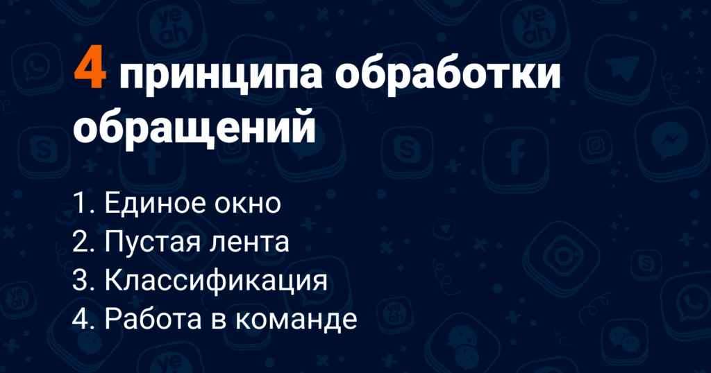 Первый принцип обработки обращений: единое окно. Вы будете терять обращения и медленно работать до тех пор, пока работаете в десяти окнах. Почта, Ватсап, Инстаграм, ВКонтакте, Телеграм, Фейсбук и другие каналы нужно объединить в одном интерфейсе. Решить эту задачу поможет Еадеск.