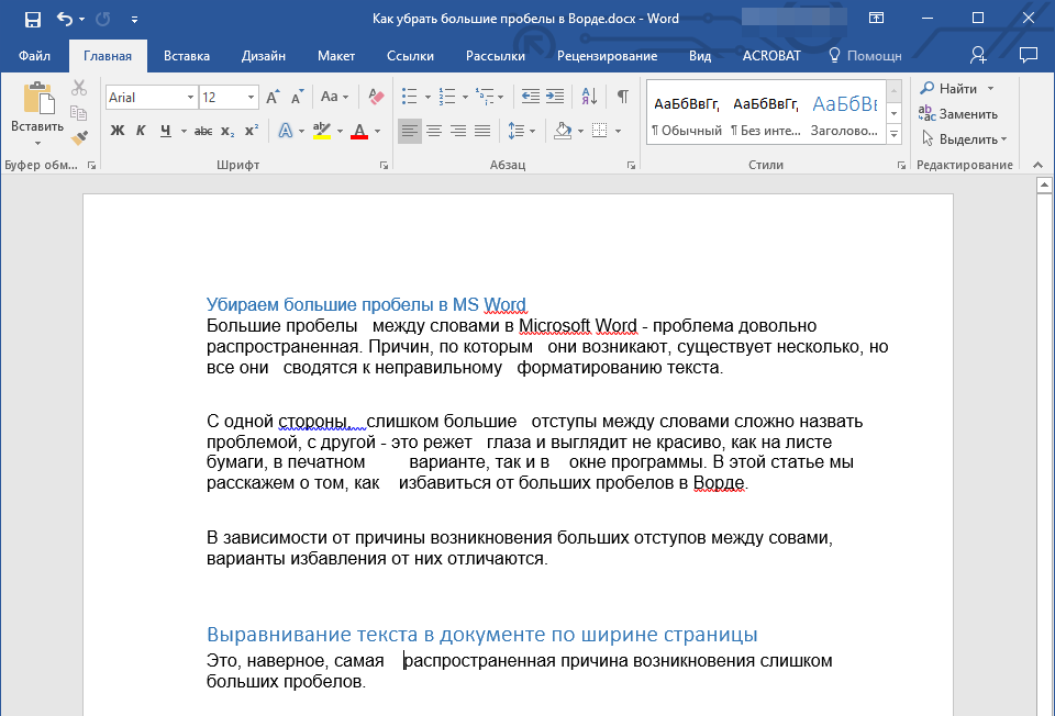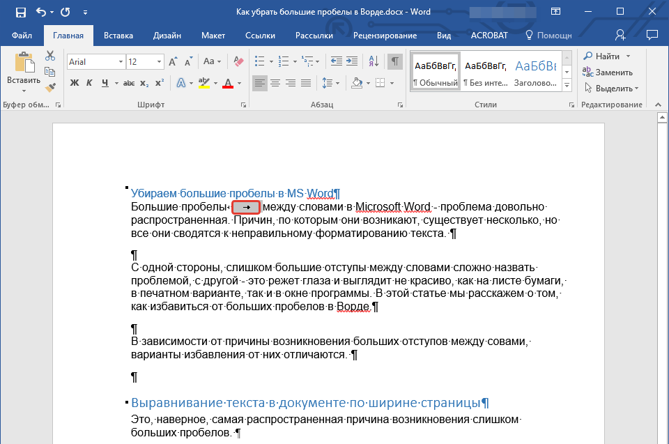 Как в Ворде убрать большие пробелы между словами