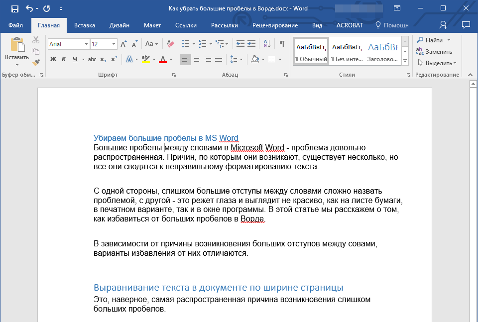Вы замечали, что между некоторыми словами в текстовом редакторе Microsoft Word отображаются излишне большие пробелы? Так вот, они появляются далеко не просто так. Как правило, это происходит из-за применения форматирования текста или отдельных его частей, также вместо пробелов могли быть использовать специальные символы. То есть, разные причины – разные способы их устранения. Из данной статьи Вы узнаете, как убрать большие пробелы в Ворде. Достаточно внимательно прочесть инструкцию и запомнить её содержимое, чтобы устранить не эстетично большие пробелы.