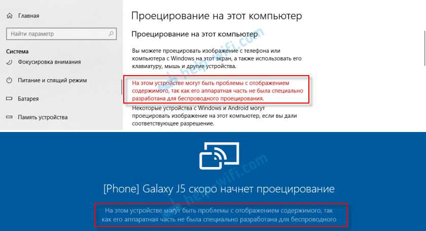 С ПК я без проблем транслирую изображение на экран ноутбука и наоборот – с ноутбука идет трансляция изображения на монитор компьютера. Использовать функцию «Проецирование на этот компьютер» для подключения телефона Samsung к ноутбуку мне так и не удалось. Телефон видит компьютер, в Windows появляется запрос на подключение, но все зависает в процессе подключения. К тому же на ноутбуке, в настройках этой функции есть следующее предупреждение: «На этом устройстве могут быть проблемы с отображением содержимого, так как его аппаратная часть не была специально разработана для беспроводного проецирования».