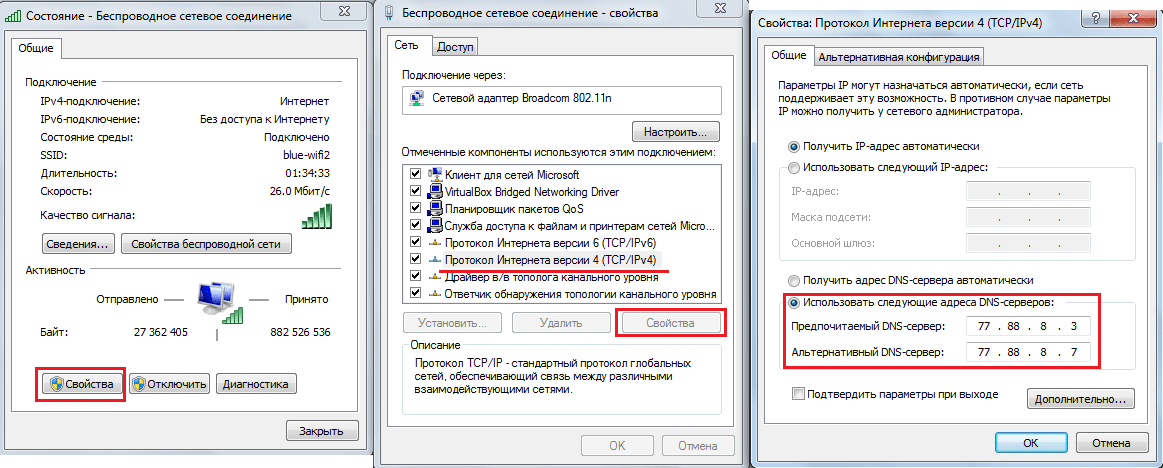 - Впишите в свойствах TCP/IP 4-й версии указанные выше DNS-сервера и сохраните настройки.