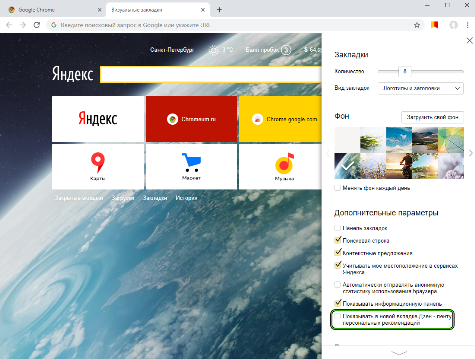 В разделе «Настройки внешнего вида» уберите галочку около предложения «Показывать в новой вкладке Дзен — ленту персональных рекомендаций».