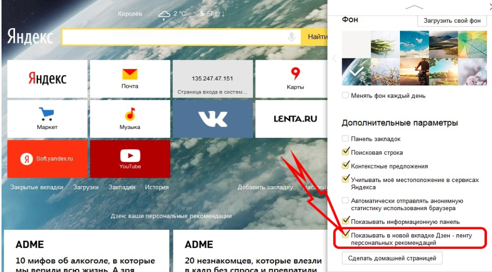Перетащите ползунок около функции «Отображать ленту рекомендаций Яндекс Дзен».