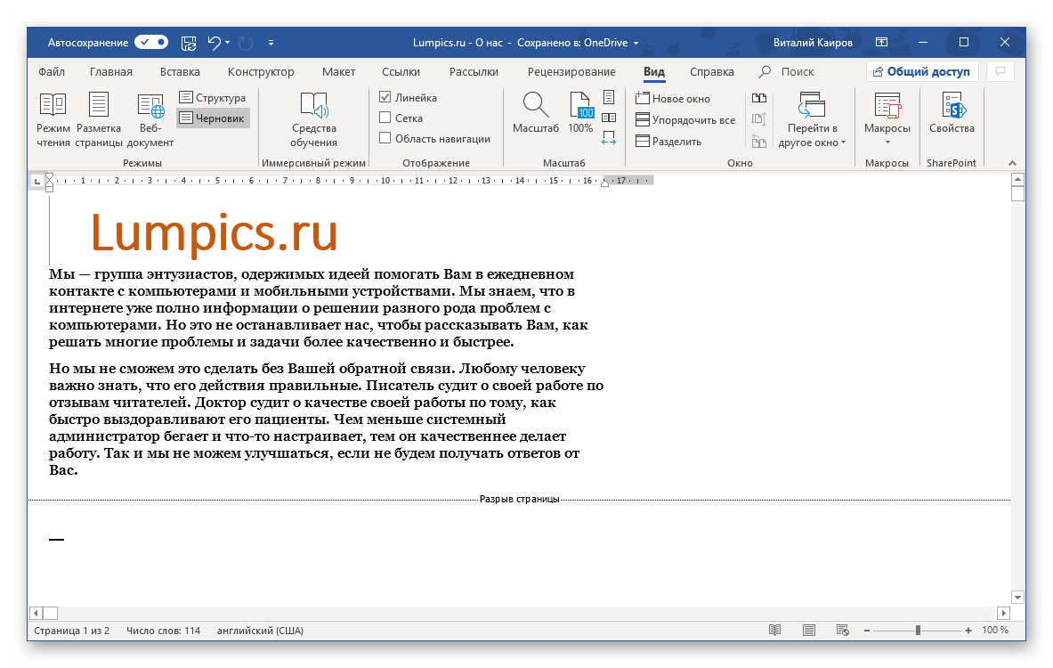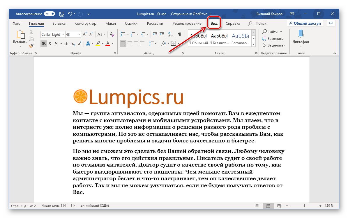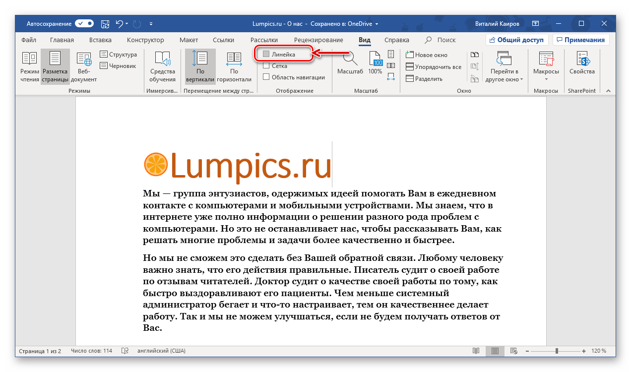 Если навести курсор-стрелку в зону над страницей или в левую часть окна, шкала с табуляторами появится, исчезнув после того, как курсор будет перемещен в другое место. Но в некоторых случаях удобнее, чтобы шкала и табуляторы были видны постоянно. Тогда потребуется включить их, и сделать это можно двумя способами: воспользовавшись кнопкой либо вкладкой «Вид» на ленте.