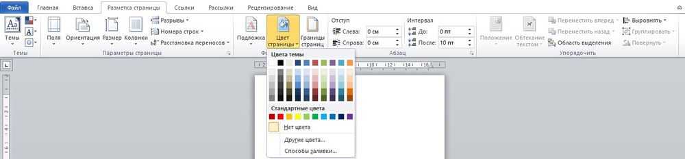 Линейка, размещенная в верхней области страницы, разделяется на два сектора: белый – отвечает за область текста документа, и серый – отвечает за поля страницы.