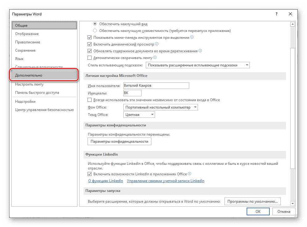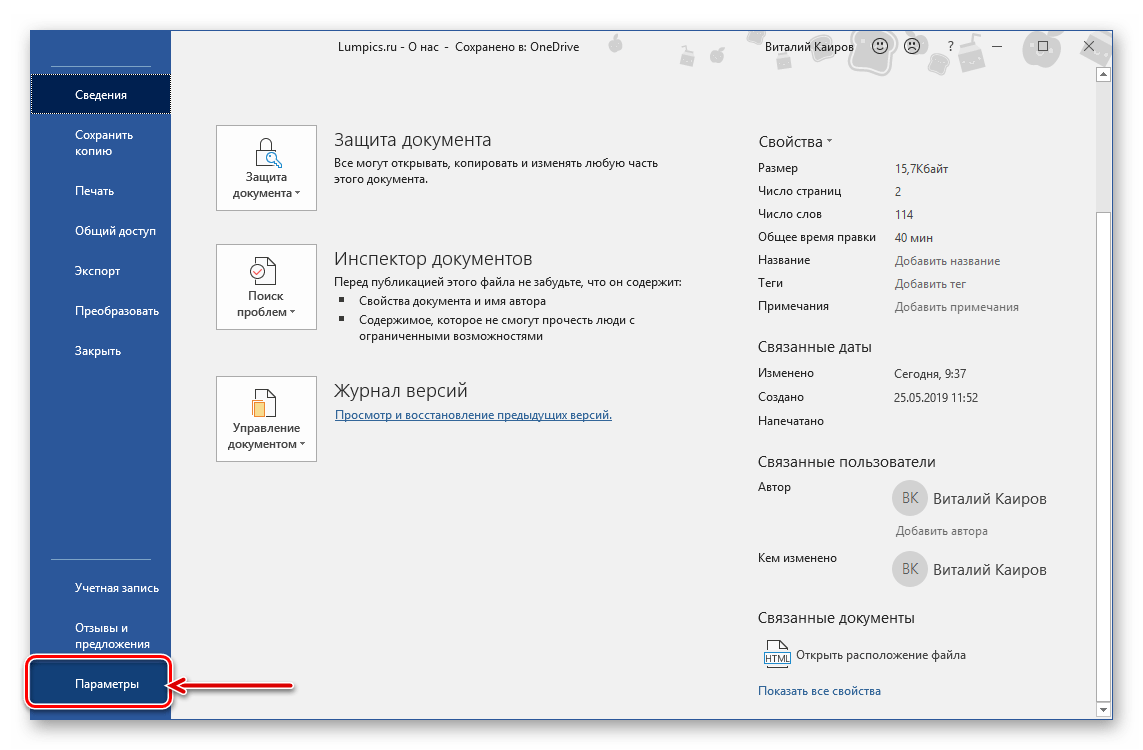 - Откройте «Параметры» программы (через меню «Файл» или кнопку с лого MS Office, зависит от версии).